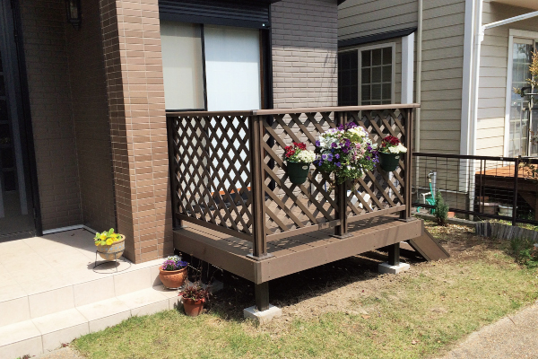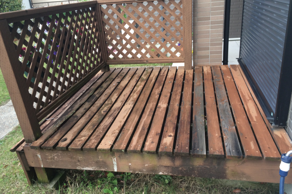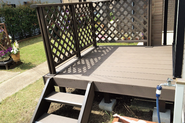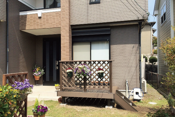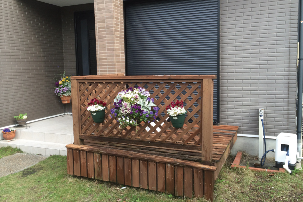 今まで使っていたウッドデッキが年月とともに老朽化してきたため、新しいものへ とお考えでしたので、ほとんどお手入れしなくてもキレイな状態が続く、人工木の デッキをオススメしました。人工木は、湿気で腐ることもないですし、シロアリにやられる 心配もありません。しかもこの樹ら楽はリアルに表現された木目で、見た目にも 十分満足頂けると思います。