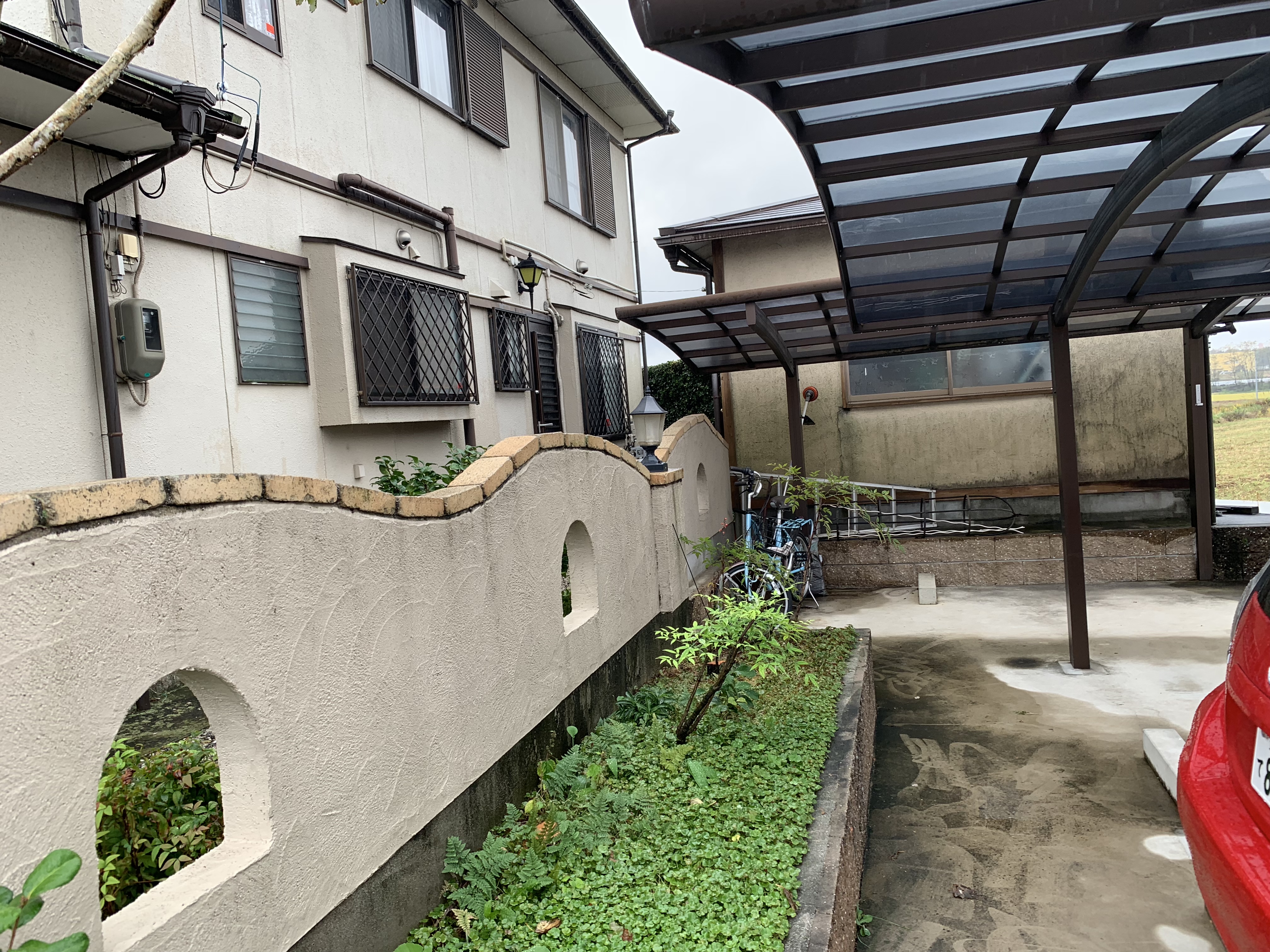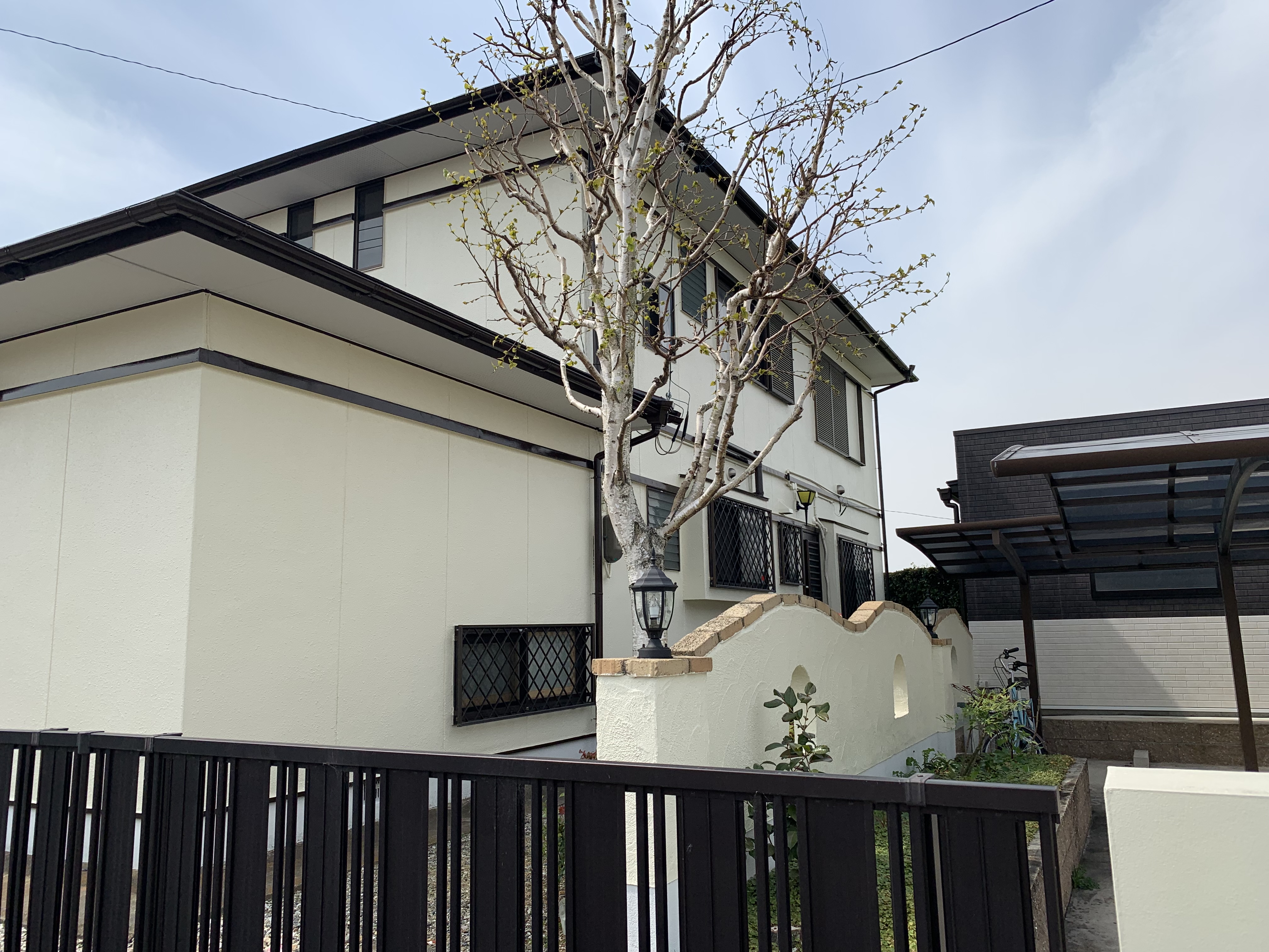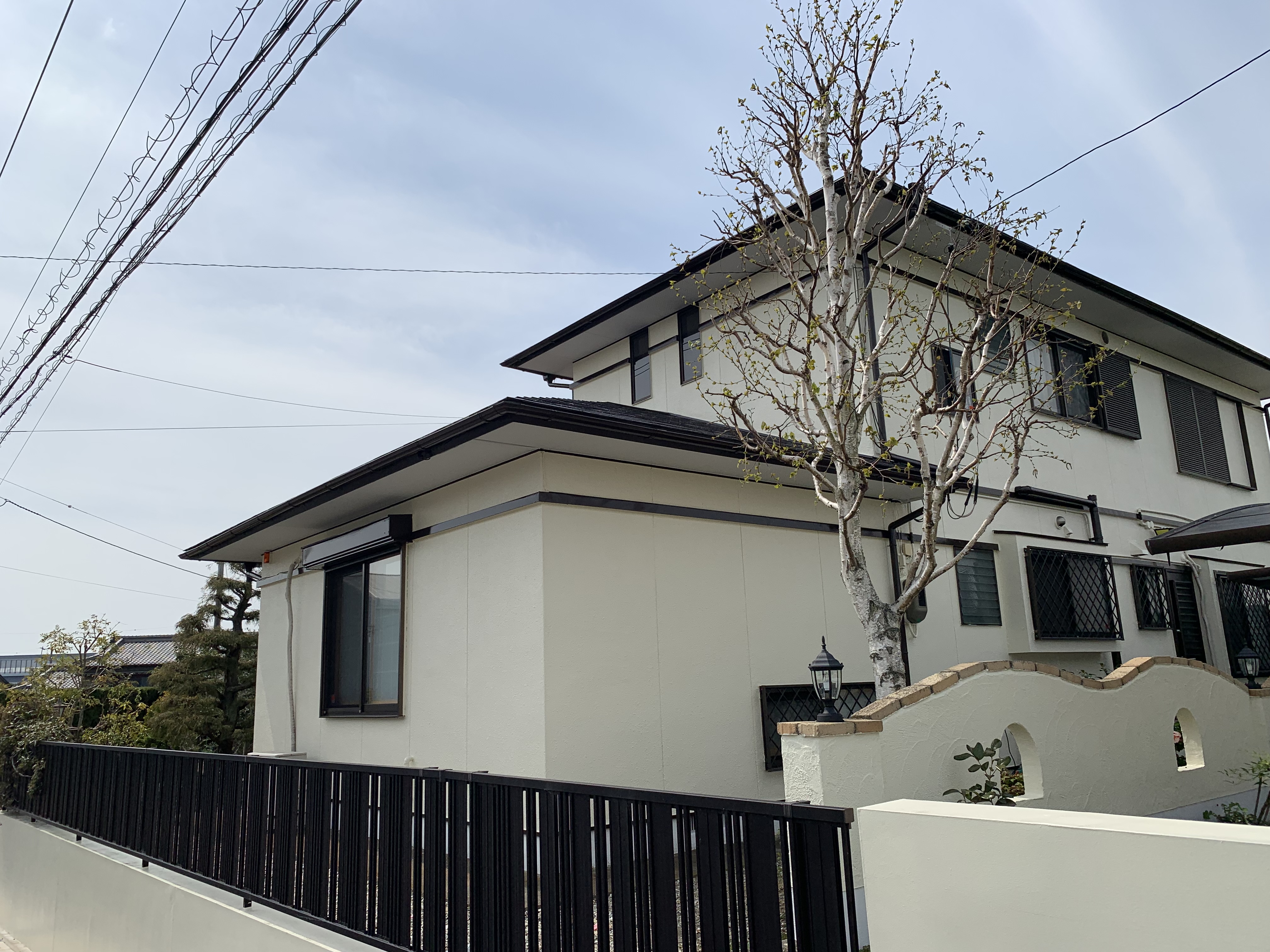 家屋の塗装工事です。外壁塗装というと壁のみの塗装を想像されるかもしれませんが、屋根、軒部、樋部、雨戸やシャッターに至るまで洗浄+塗装を施します。外壁塗装をすることによって建物の美観が高まるのはもちろん、外壁そのものを保護し耐久性や防水性が高まります。