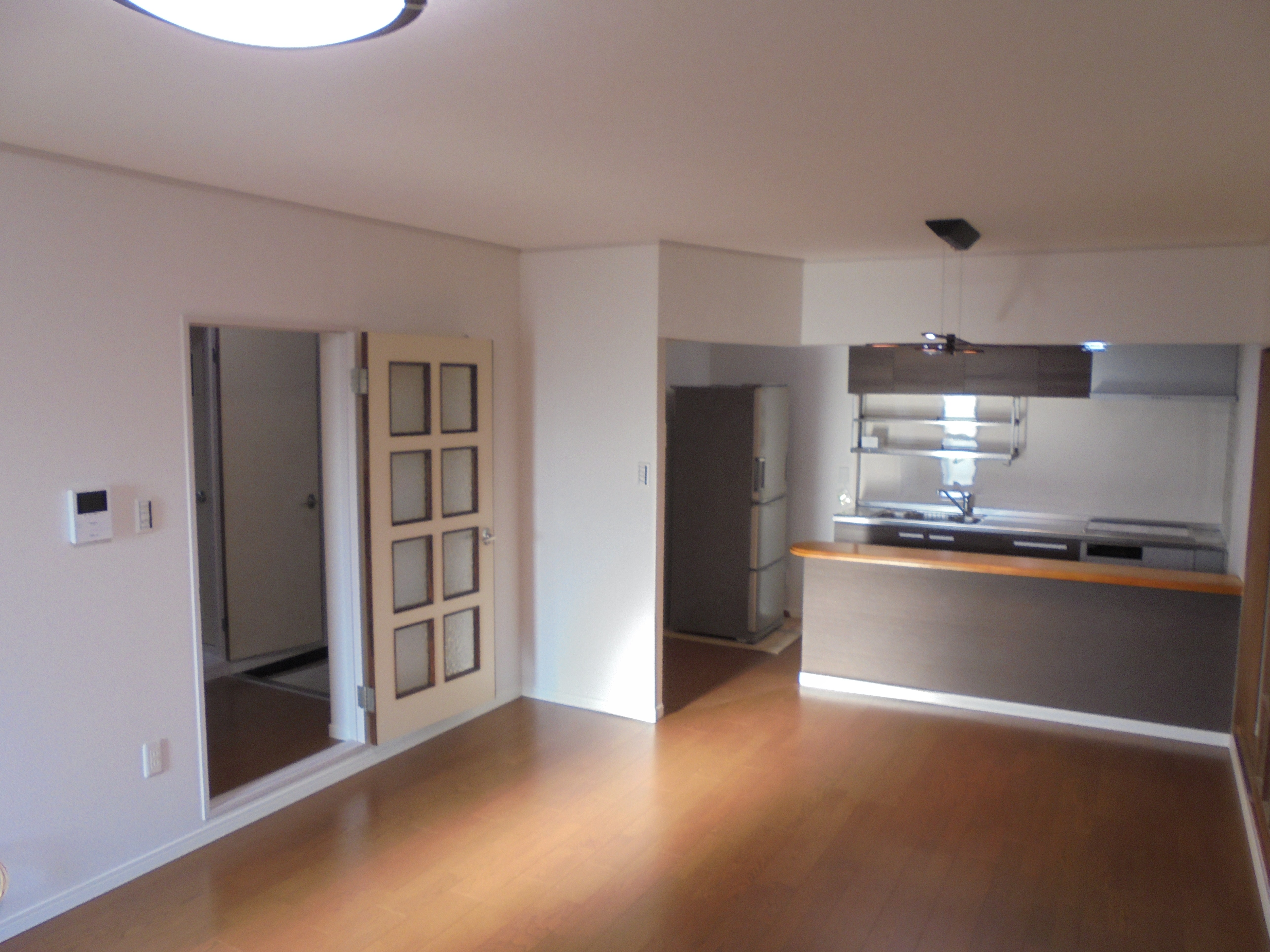天井、壁のクロス貼り替え、床カーペットから防音フローリングへの張り替え、システムキッチンへの取替工事を実施。 システムキッチンの扉カラーとカウンター下のクロス色をブラウン系に統一することで、落ち着いた雰囲気の空間を演出しました。