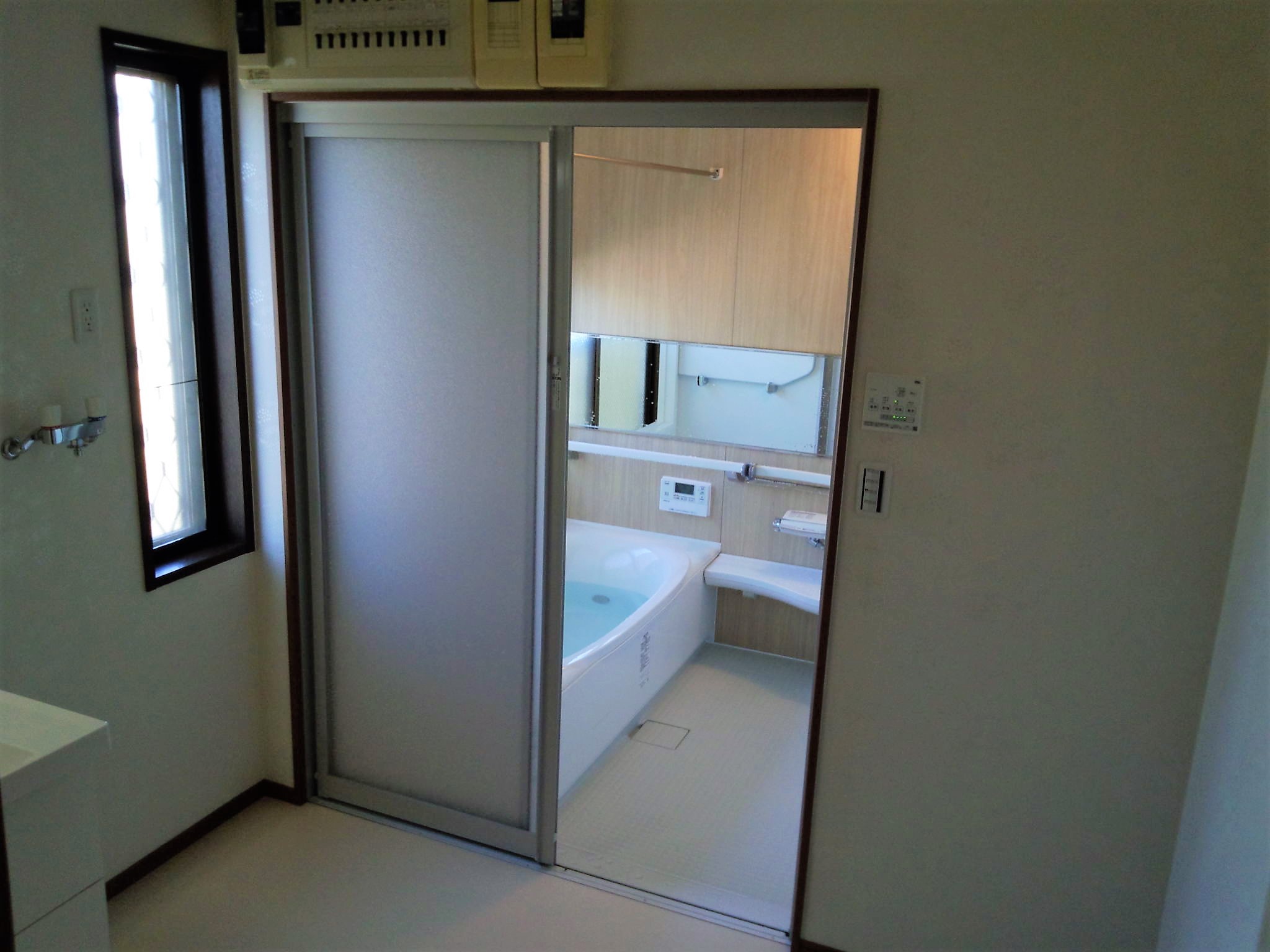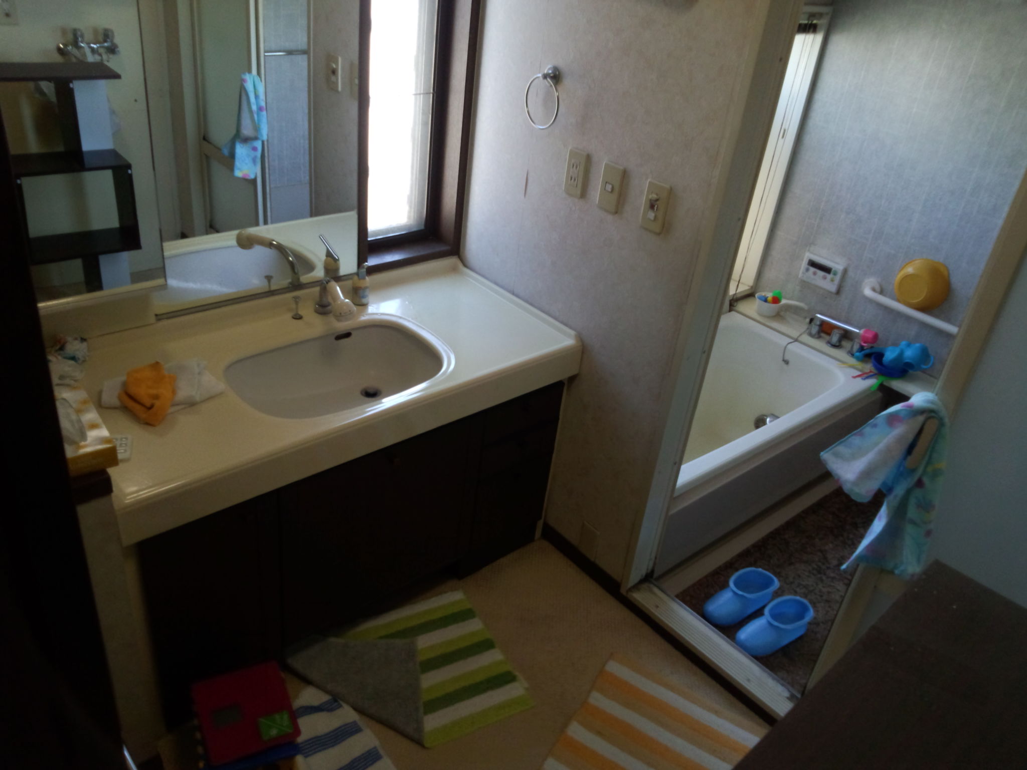 1Fのリビング&水廻りのリフォームです。対面キッチンを実現するためトイレや浴室をサイズダウン、廊下の一部もLDKにするなどし、広々とした空間に生まれ変わりました。