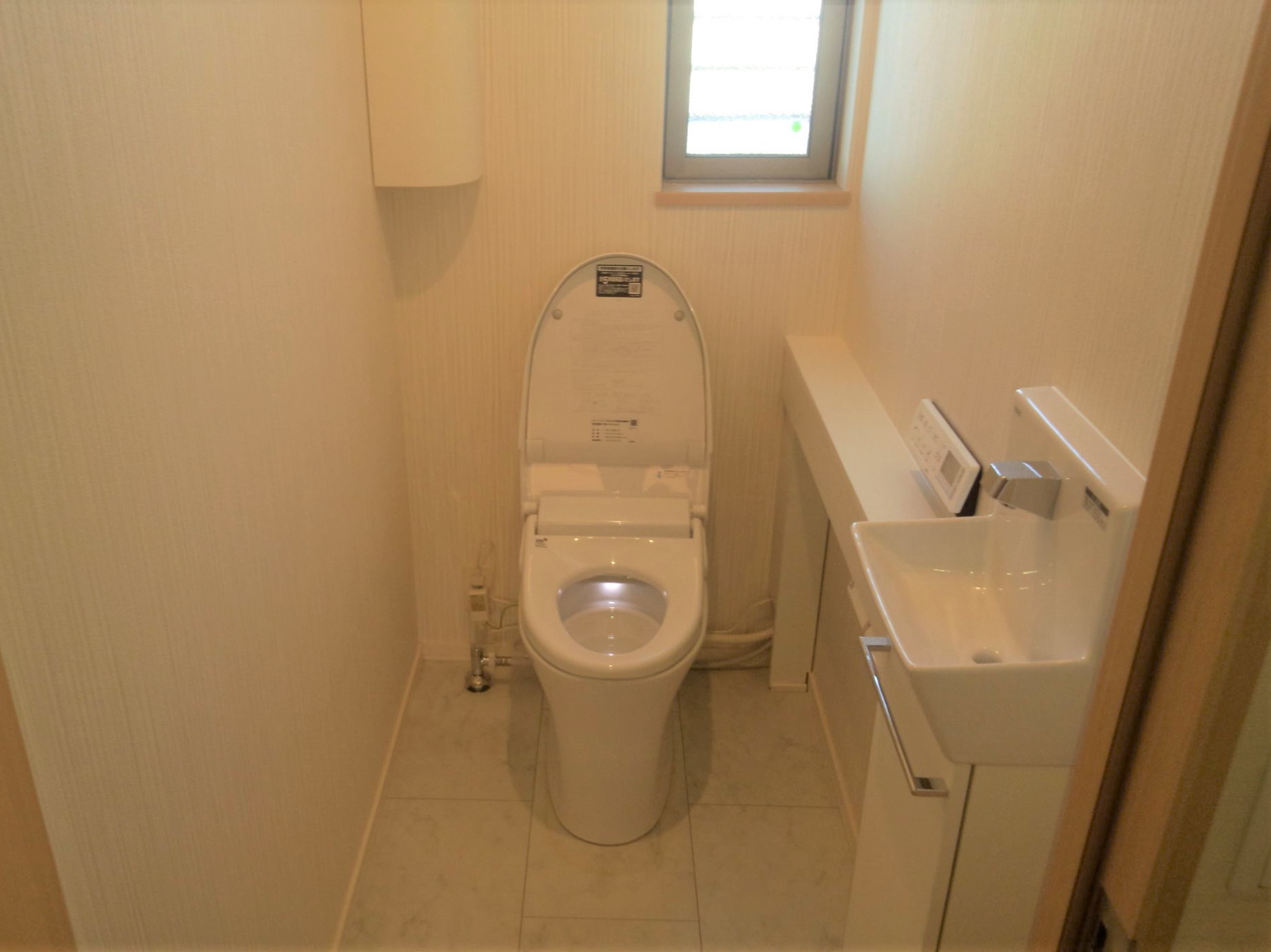 トイレの改装とカップボードの取付け工事です。トイレはプラズマクラスターイオンが付着菌やにおい原因菌を除菌してくれるので不快なにおいから解放される『リクシル サティスS』をご選択されました。