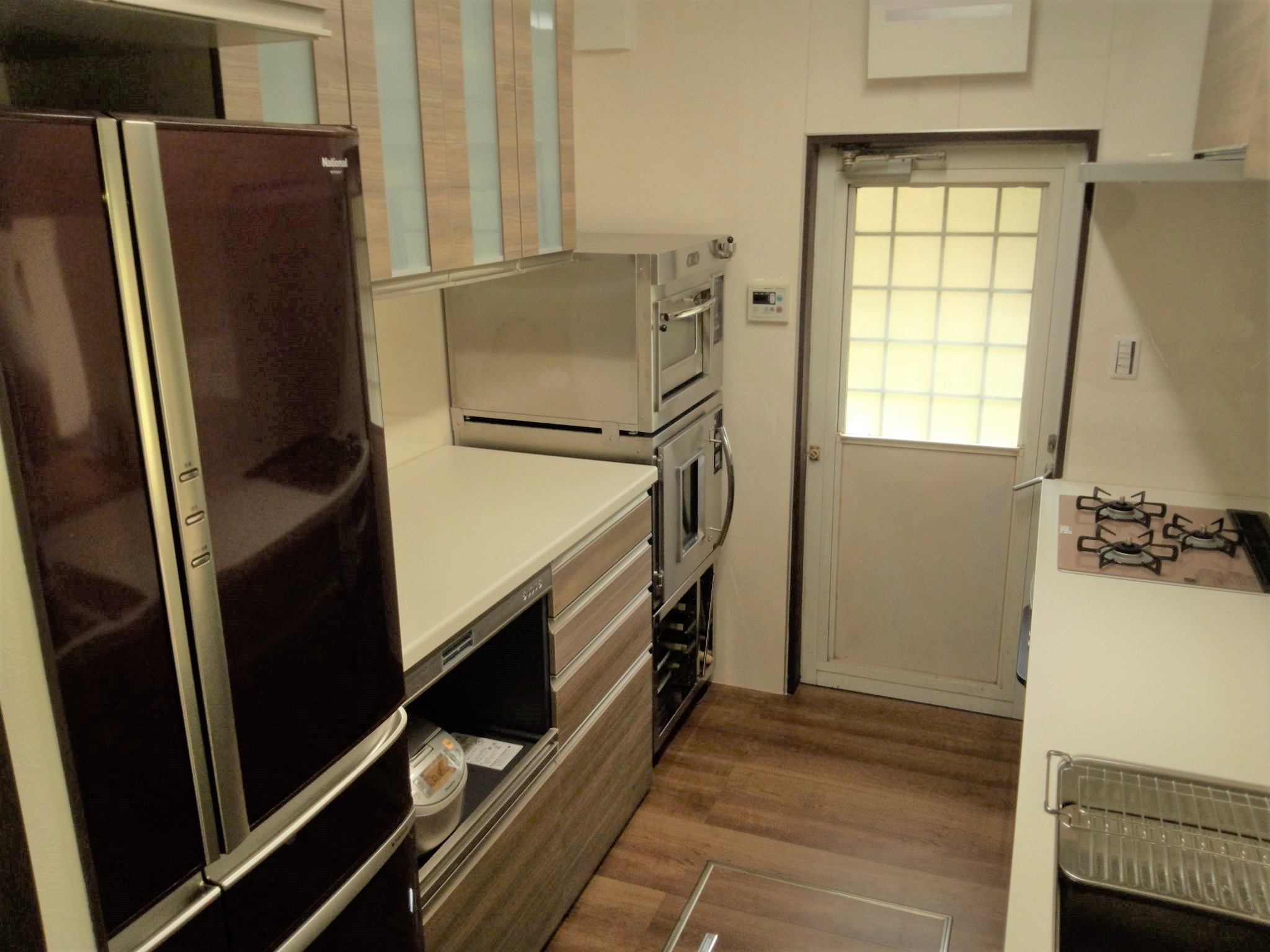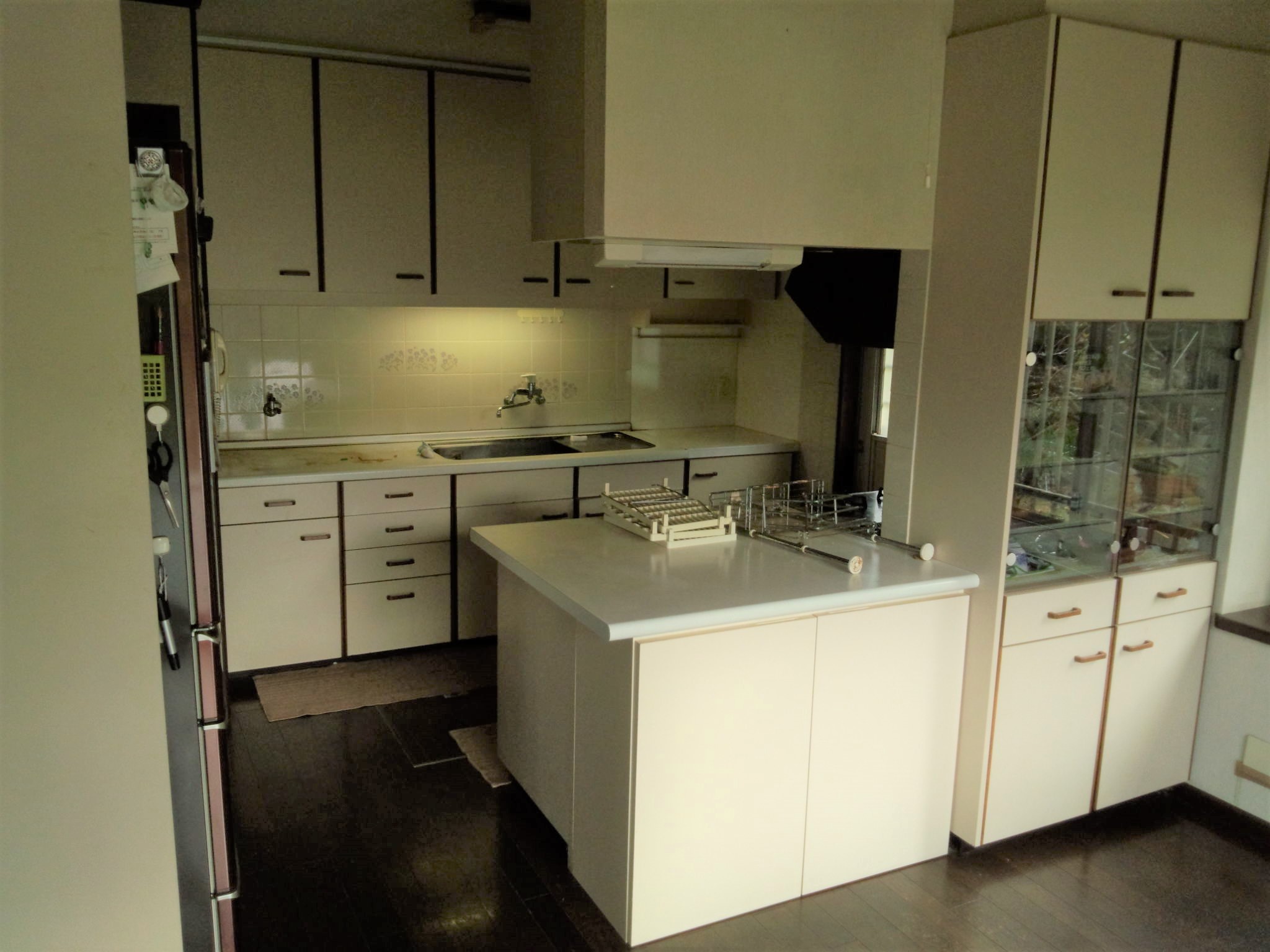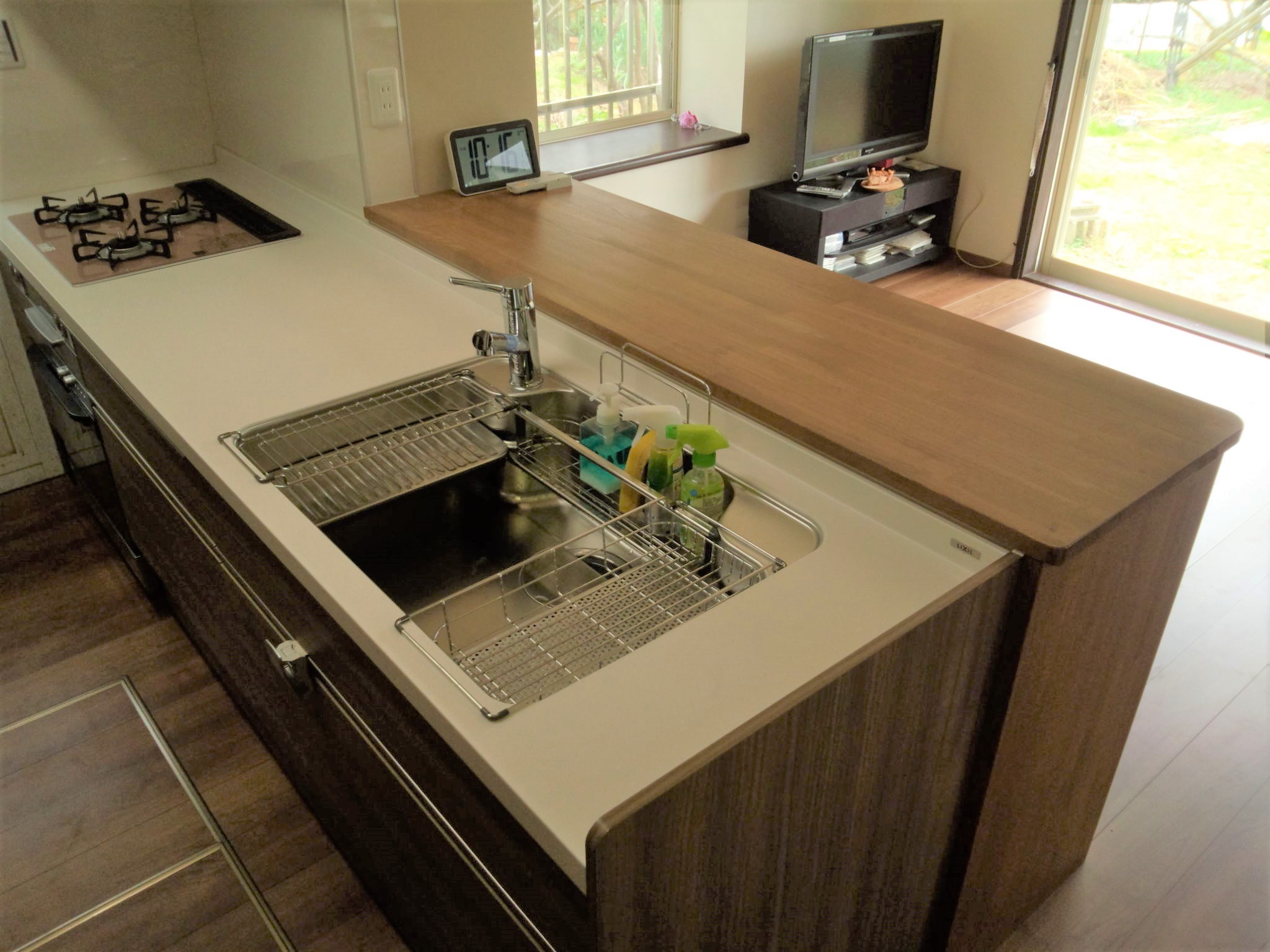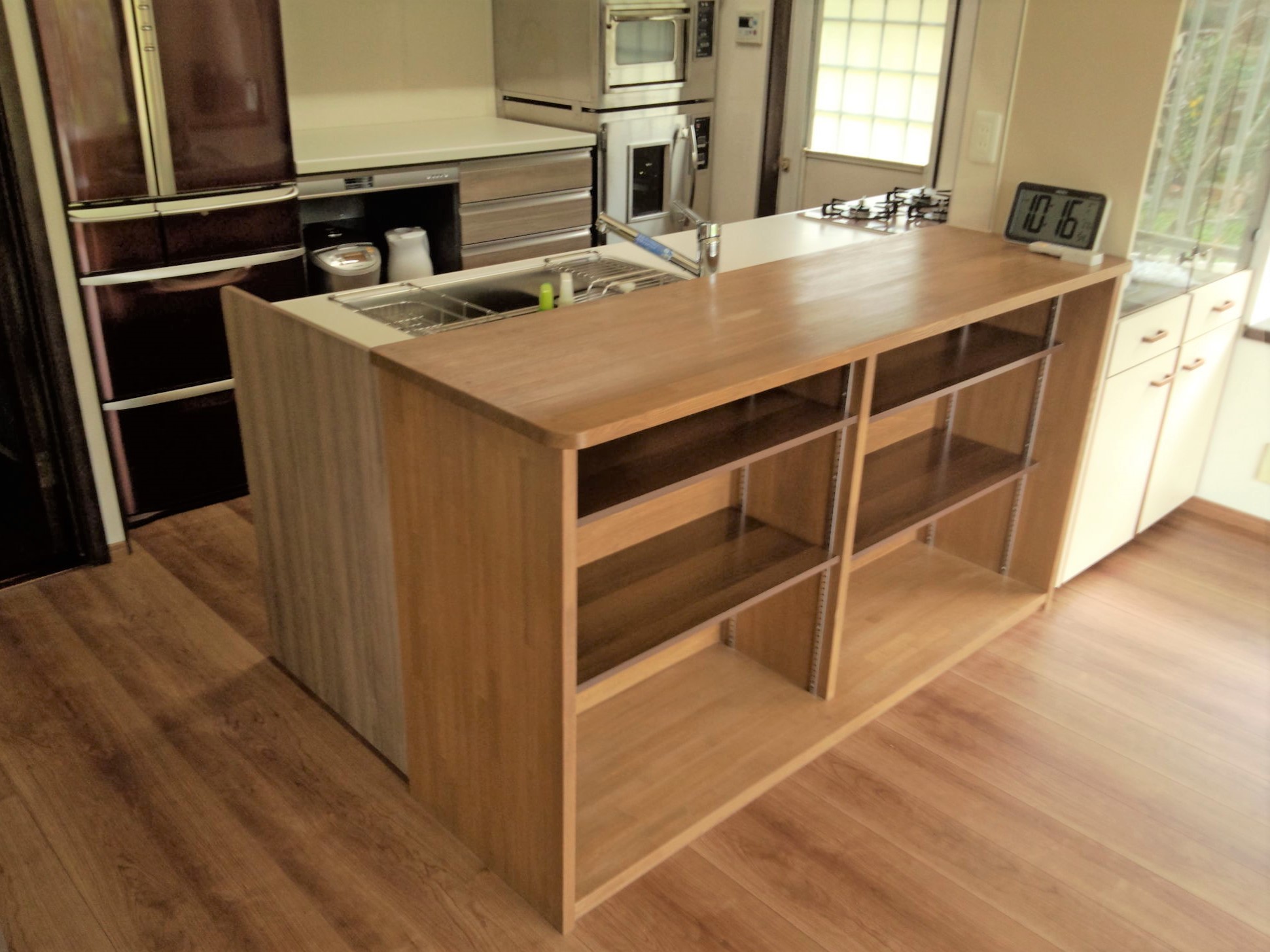 キッチンとリビングのリフォームです。料理が得意でパン教室をされている奥様のご要望で、キッチンカウンターは奥行きを500mmとって作業台として使えるようにしました。またその下には調理器具がたくさん収納できるような棚を造作いたしました。