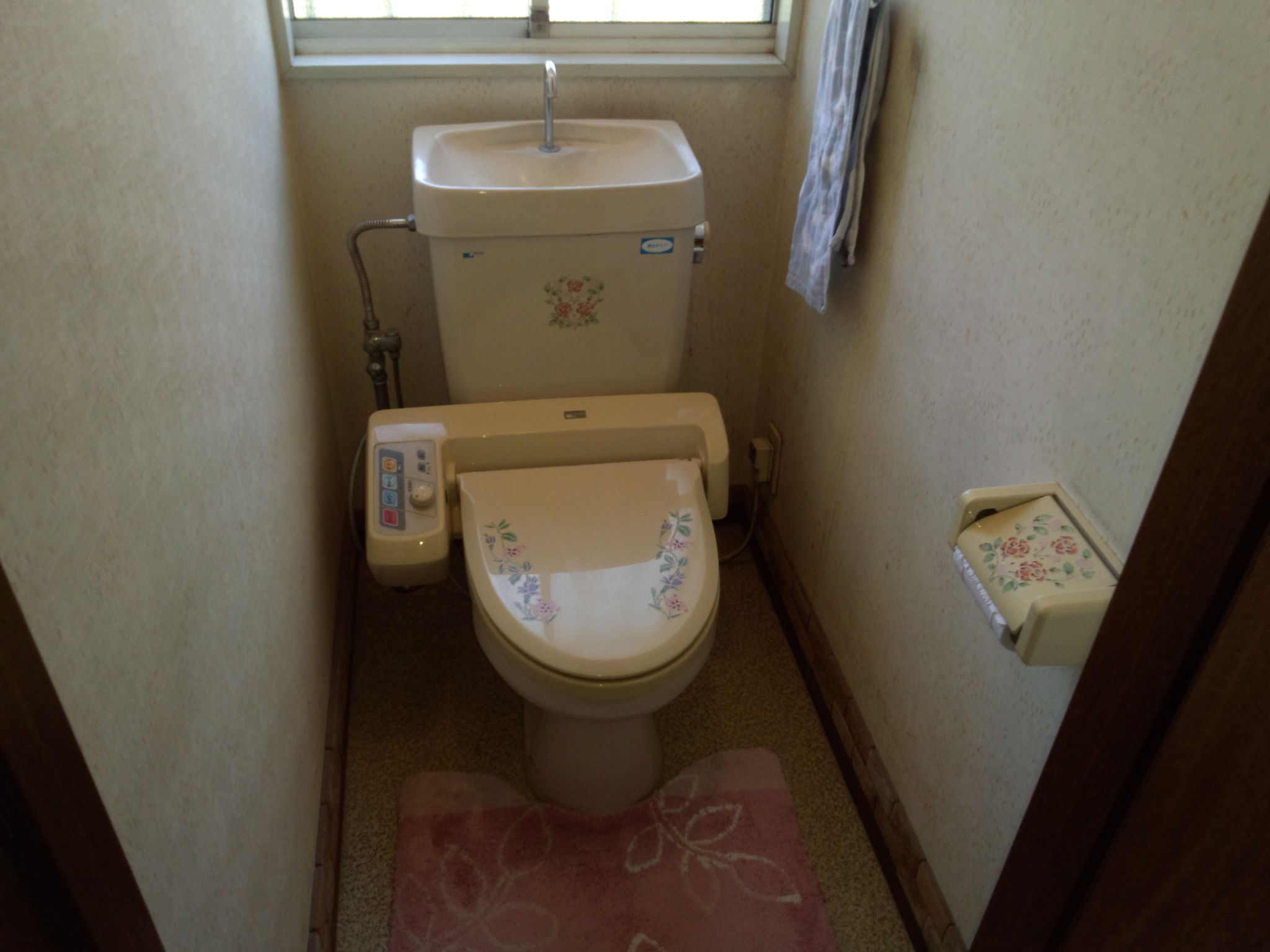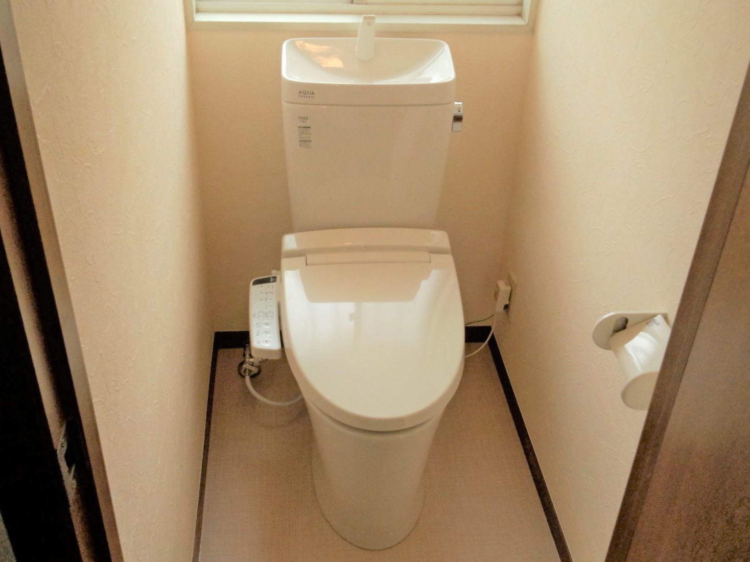 トイレの改装です。お選び頂いたのは従来の陶器では出来なかった「ガンコな水アカ」も「汚れ」もどちらも落とせるアクアセラミック製のものです。便器交換だけでなく床や壁なども貼り替えましたので、新築のような仕上がりです。また天井には花柄のクロスを選んで頂き、とても明るく可愛らしい雰囲気になりました。