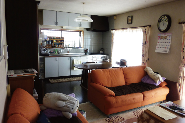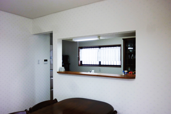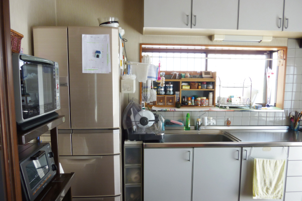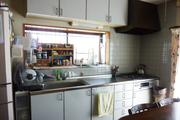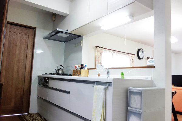 少し増築をし、その増築部にキッチンを置くことで、背面式キッチンから家族の顔 が見える対面式キッチンへと変更しました。調理しながら、ビングやダイニングを見渡せる 開口部分は、元々キッチンの壁にあった窓の開口を活かしています。キッチンは 掃除のしやすいフラットスリム換気扇で、お手入れもラクラクです。