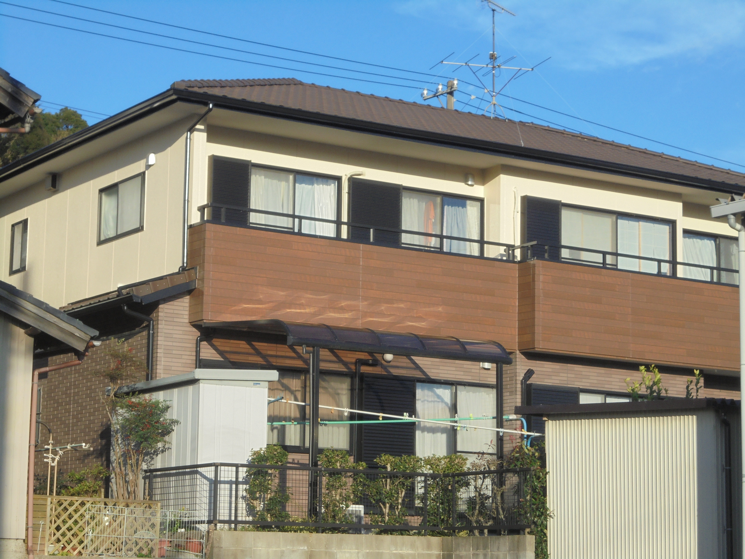 - 化粧サイディング部:日本ペイント UVプロテクトクリヤー 2階部:日本ペイント パーフェクトトップ (ハイブリッド高耐候性塗料) サイディング張替部:ニチハ モエンエクセラード キャスティングウッド ミディアムブラウン