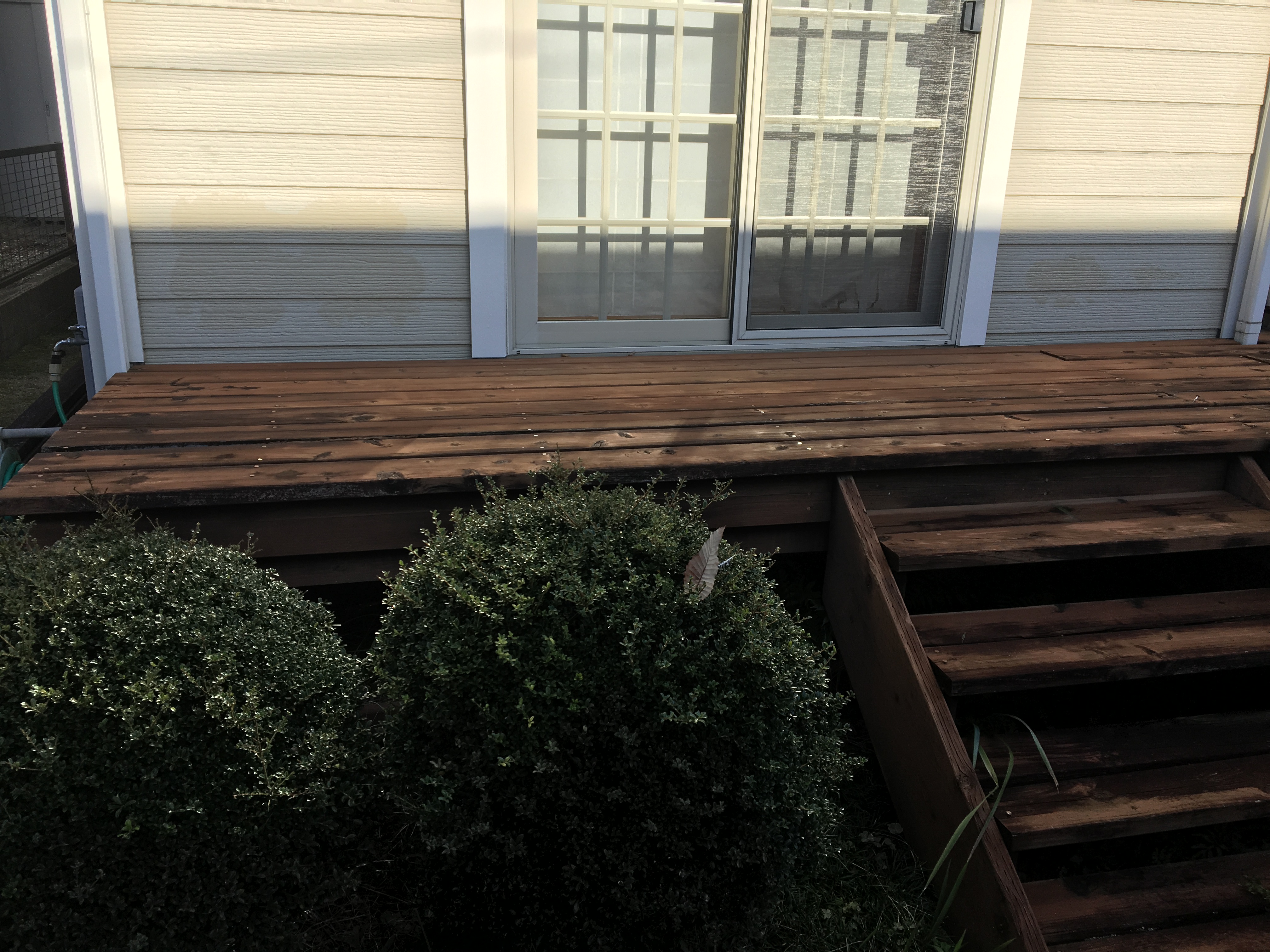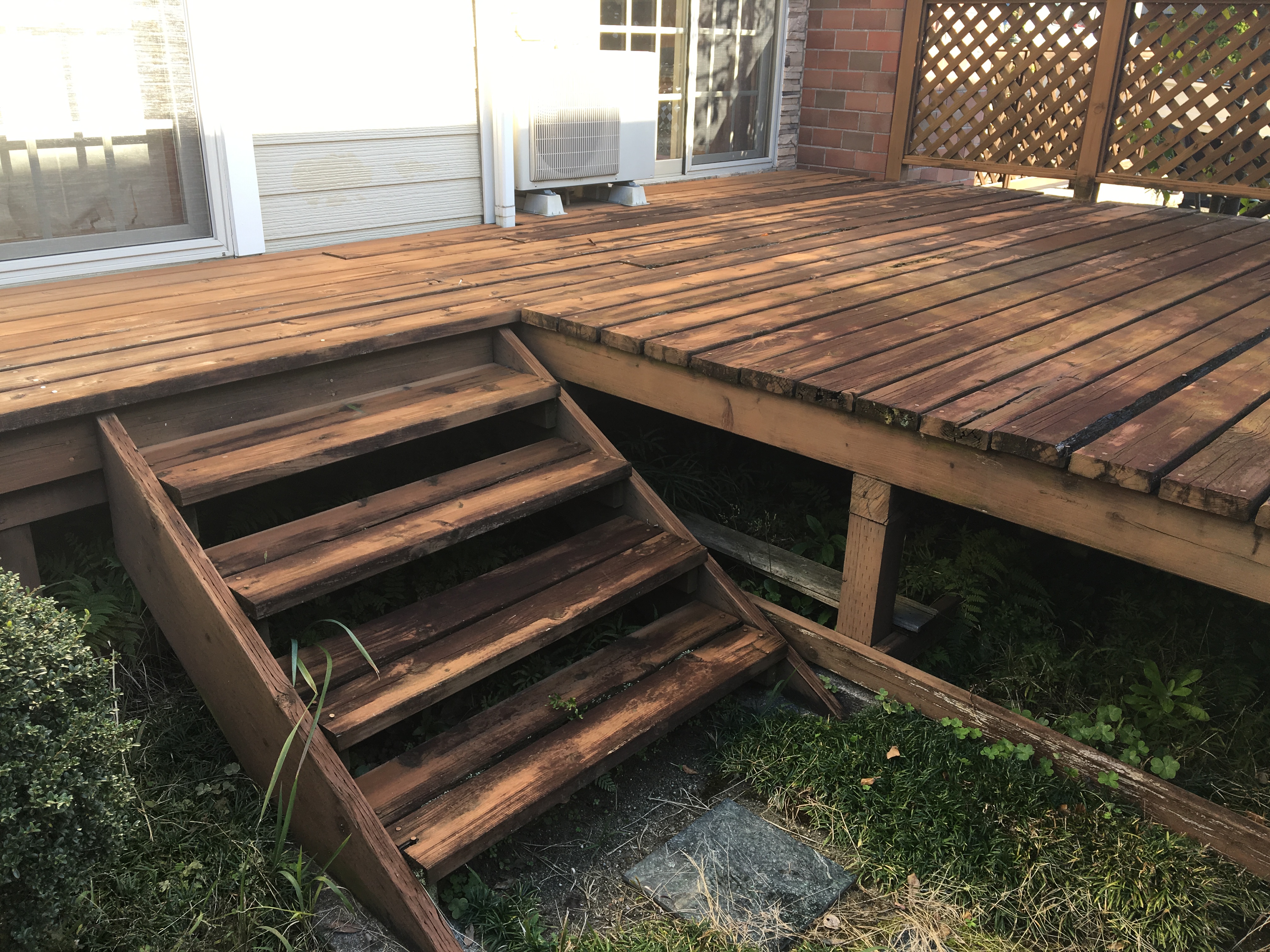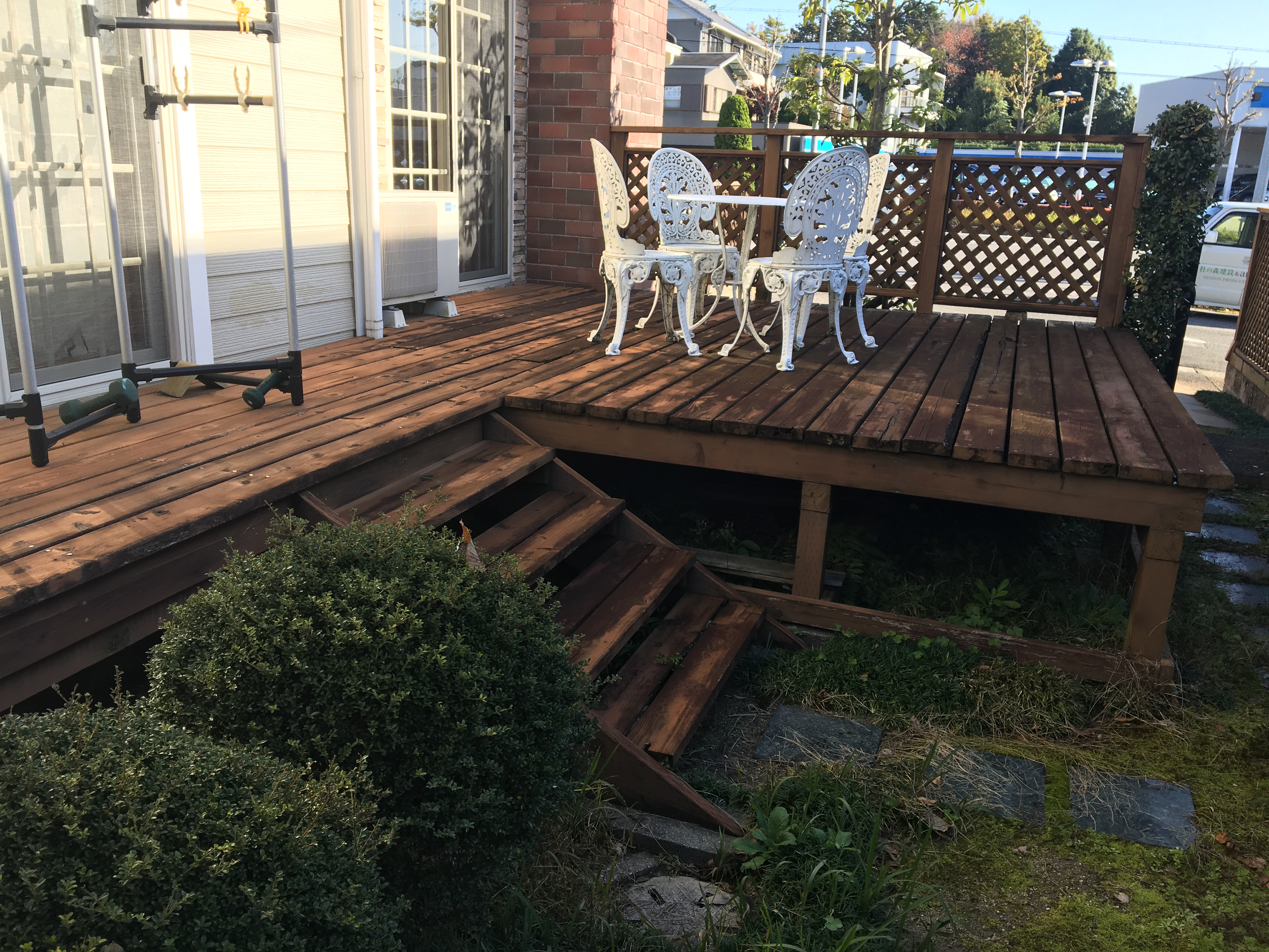 既設のウッドデッキは、3年に1度ぐらいのペースでお施主様が塗装していましたが、それでも腐食が進み床板が抜けそうで危ないので、メンテナンスの必要が少ないウッドデッキにしたいとのご要望でした。そこでおすすめしたのが、リクシルの『樹ら楽(じゅららく)』です。人工木とアルミの組み合わせでほとんどメンテナンスの必要性がありません。デッキの下には草が生え放題になっており、湿気も溜まると悩まれていましたので、この機会に土間打ちもしていきます。