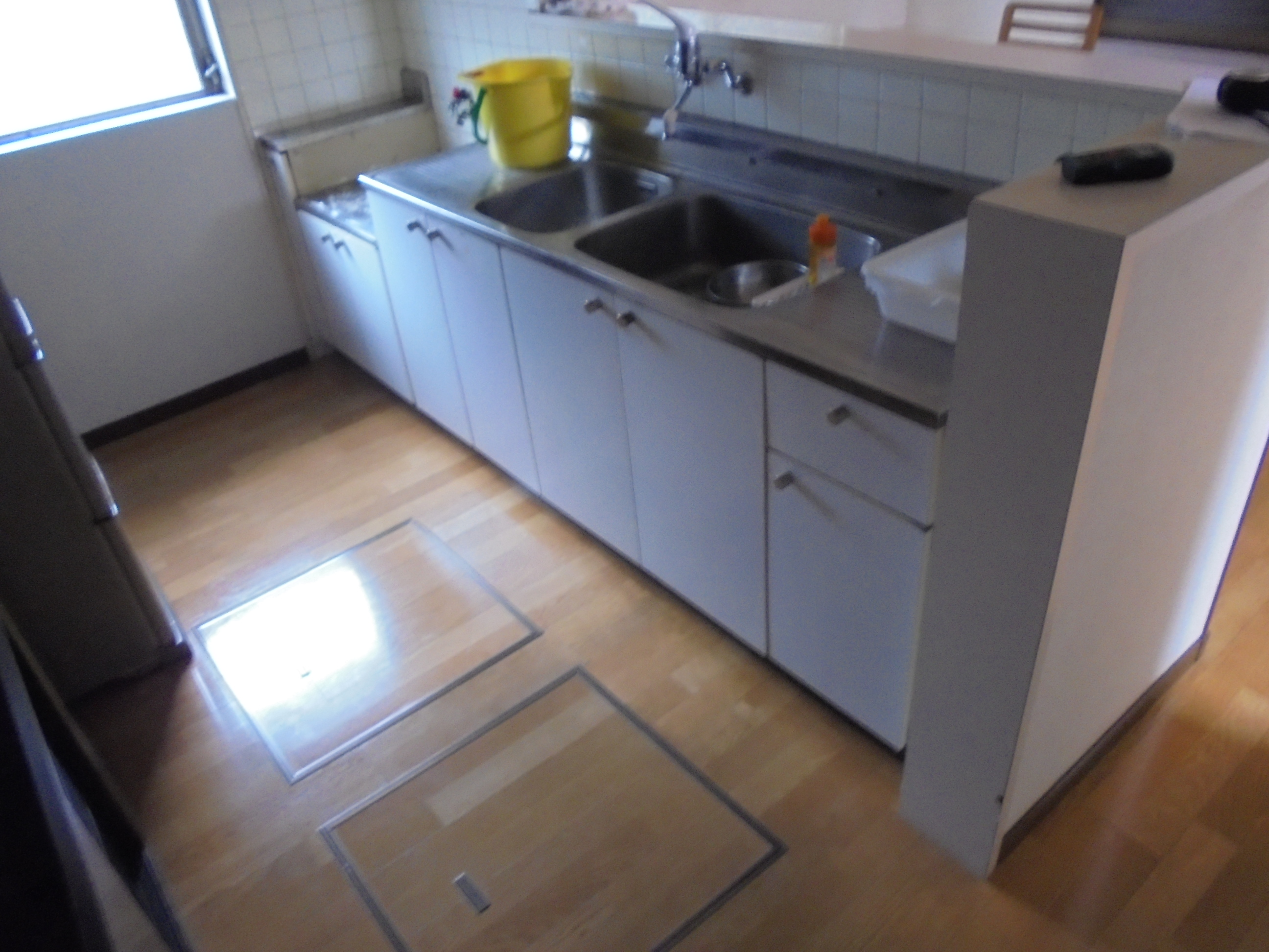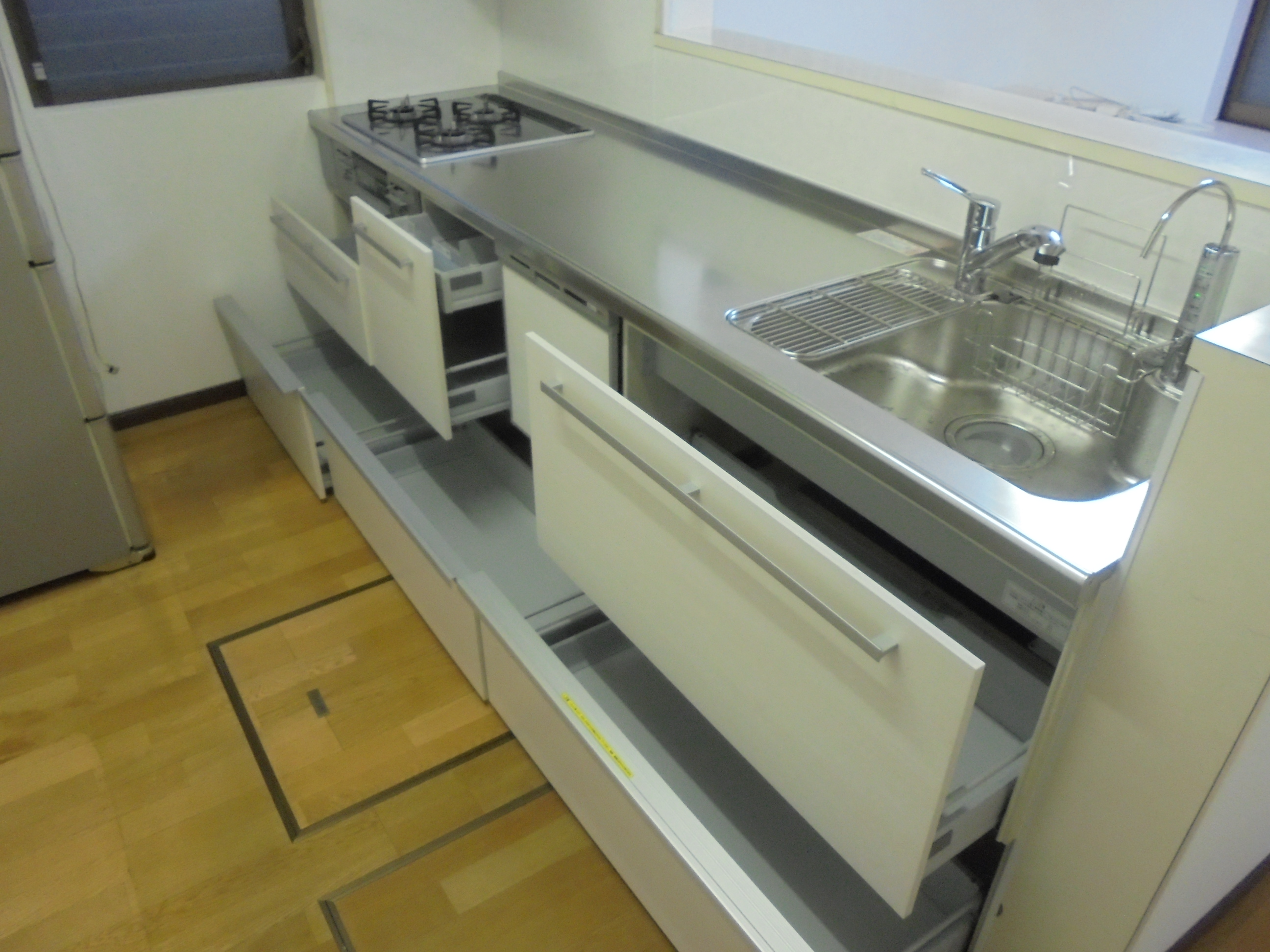 単体キッチンからシステムキッチンへの入替工事のご依頼。 元の収納は開き扉の為、もの出し入れがしにくく、かがんだ姿勢での 出し入れになる為、不便がありました。 今回、引出タイプのシステムキッチンにすることで、そういった毎日の不便が解消されました。