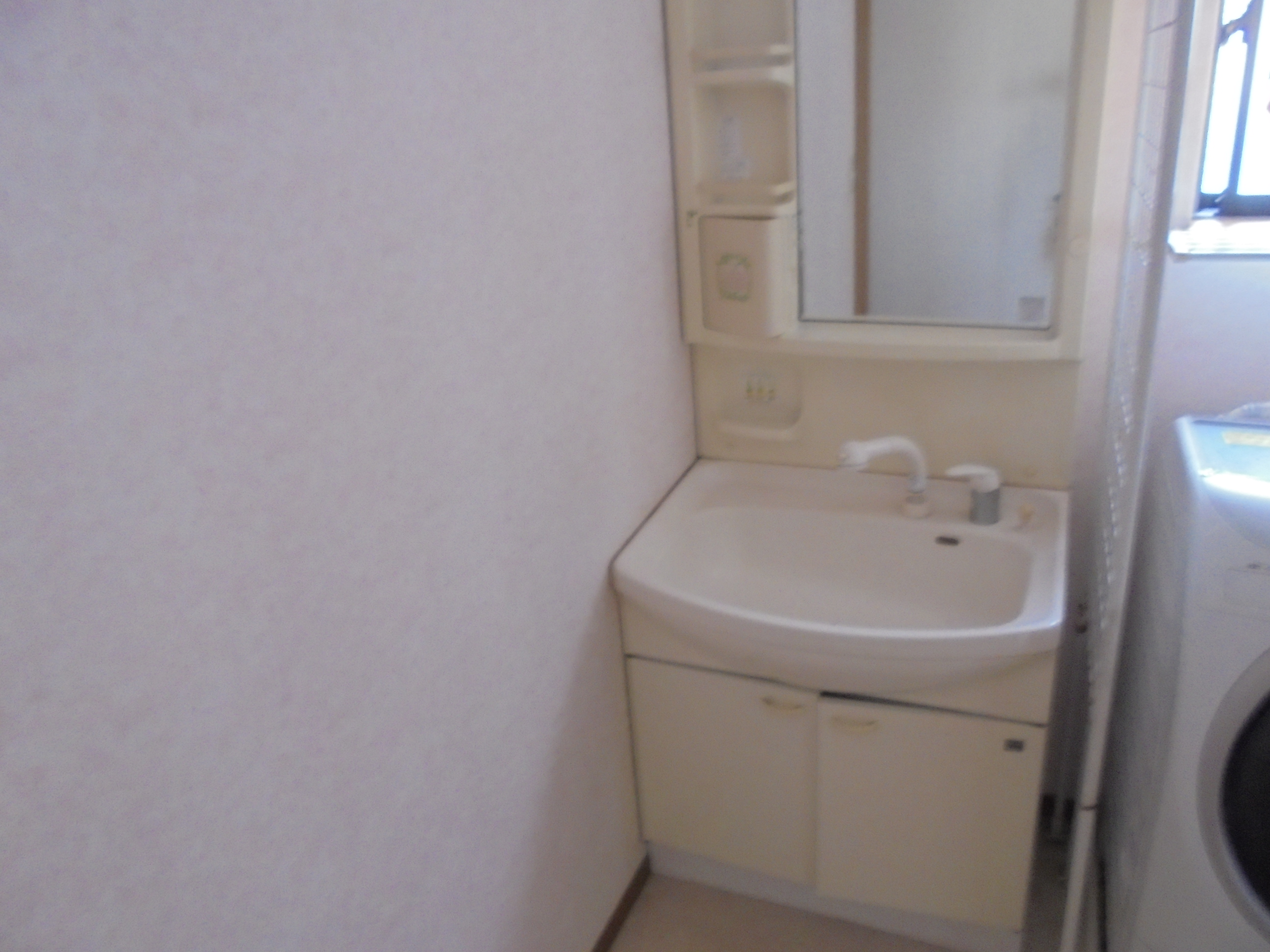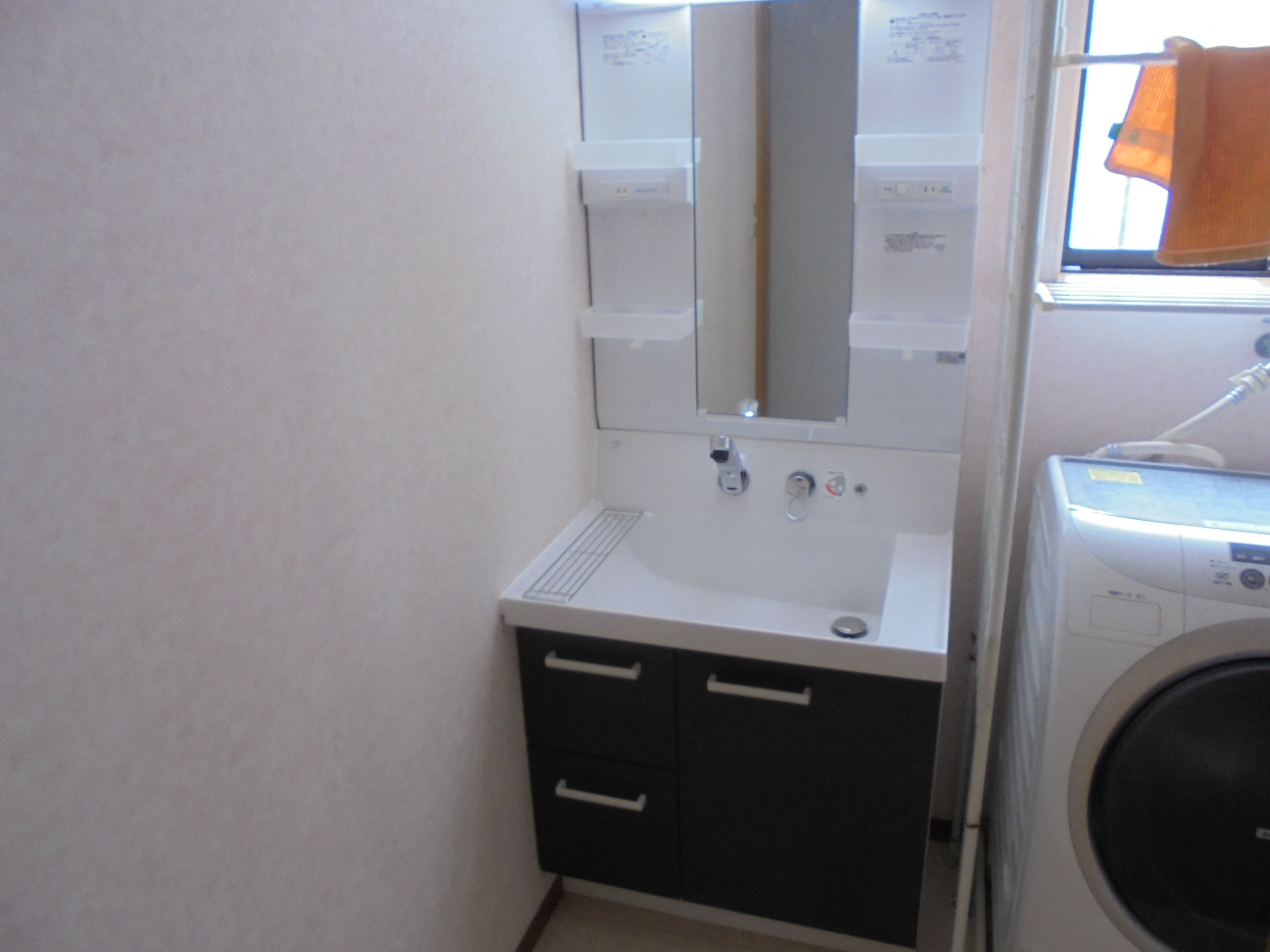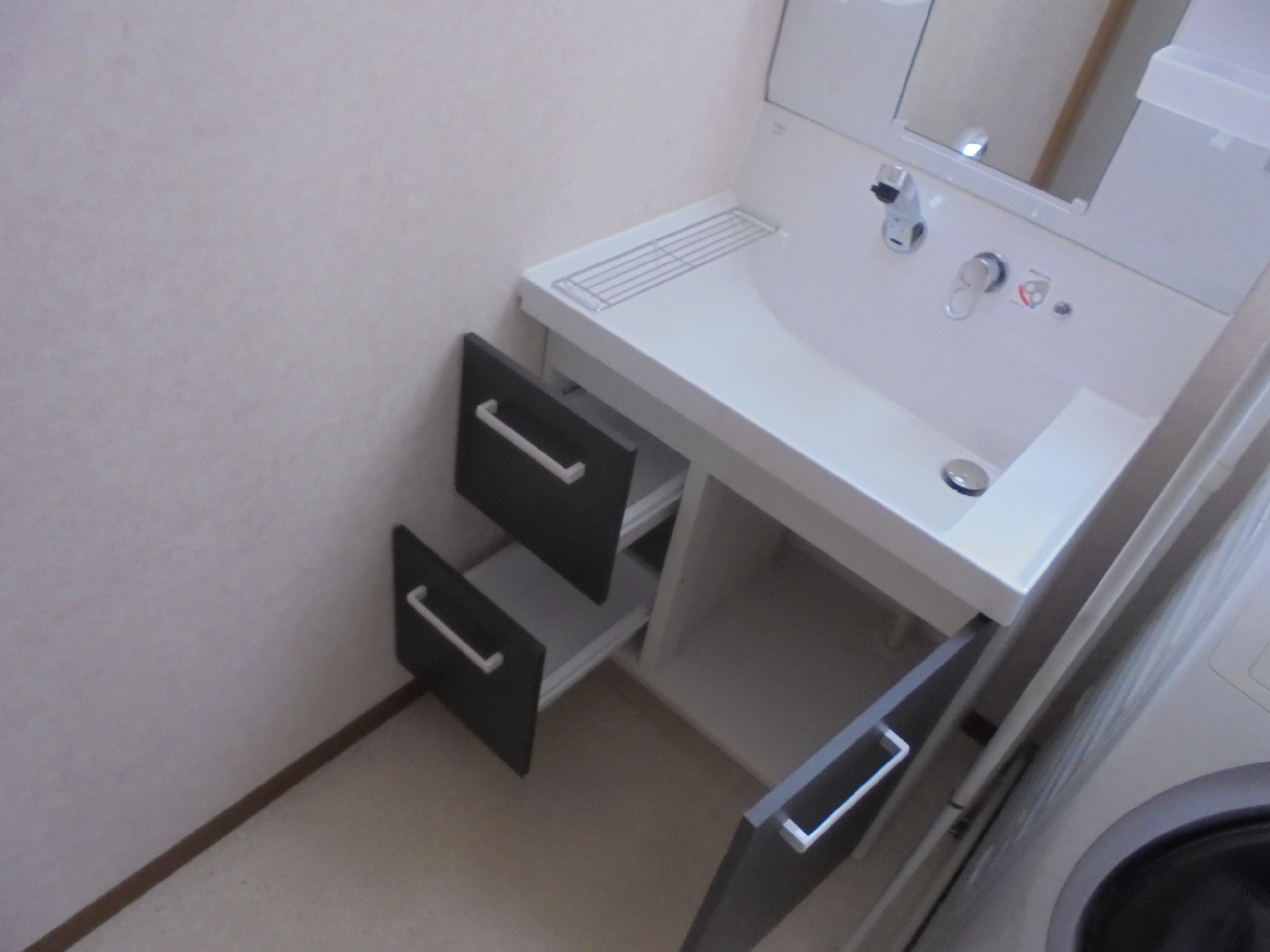 洗面化粧台の取替え工事を実施。リクシルのピアラをご採用頂きました。 この商品の特徴は水栓が壁付けになっていることと、大型の人大ボウルです。 従来型の洗面台は水栓金具がボウルの水平面に設置されており、 飛び散った水が水アカやカビの原因となりました。 しかし、ピアラは洗面ボウルの立ち上り面(正面の壁面)に、水栓が取り付けられており、 はねた水は下の排水口に落ちてゆく形状となっている為、汚れにくく、また掃除もしやすい形状となっています。