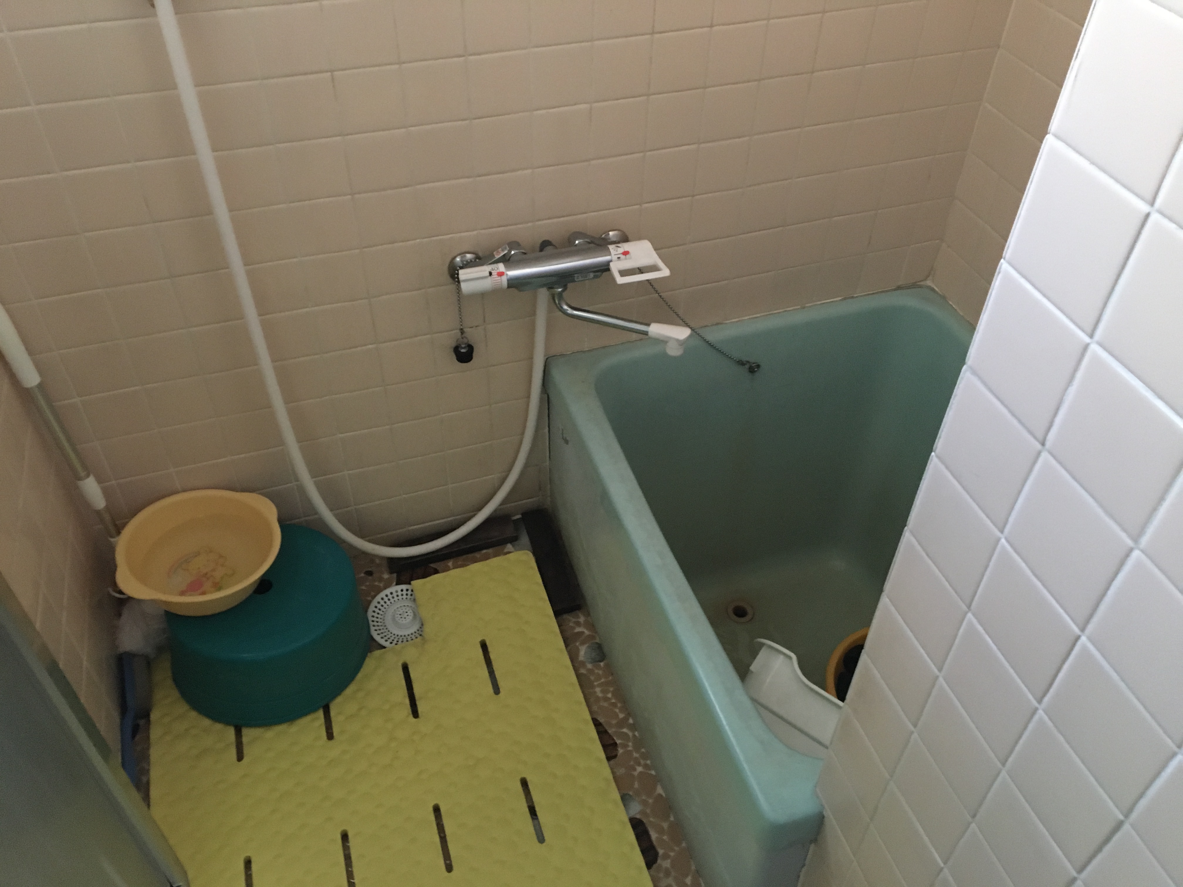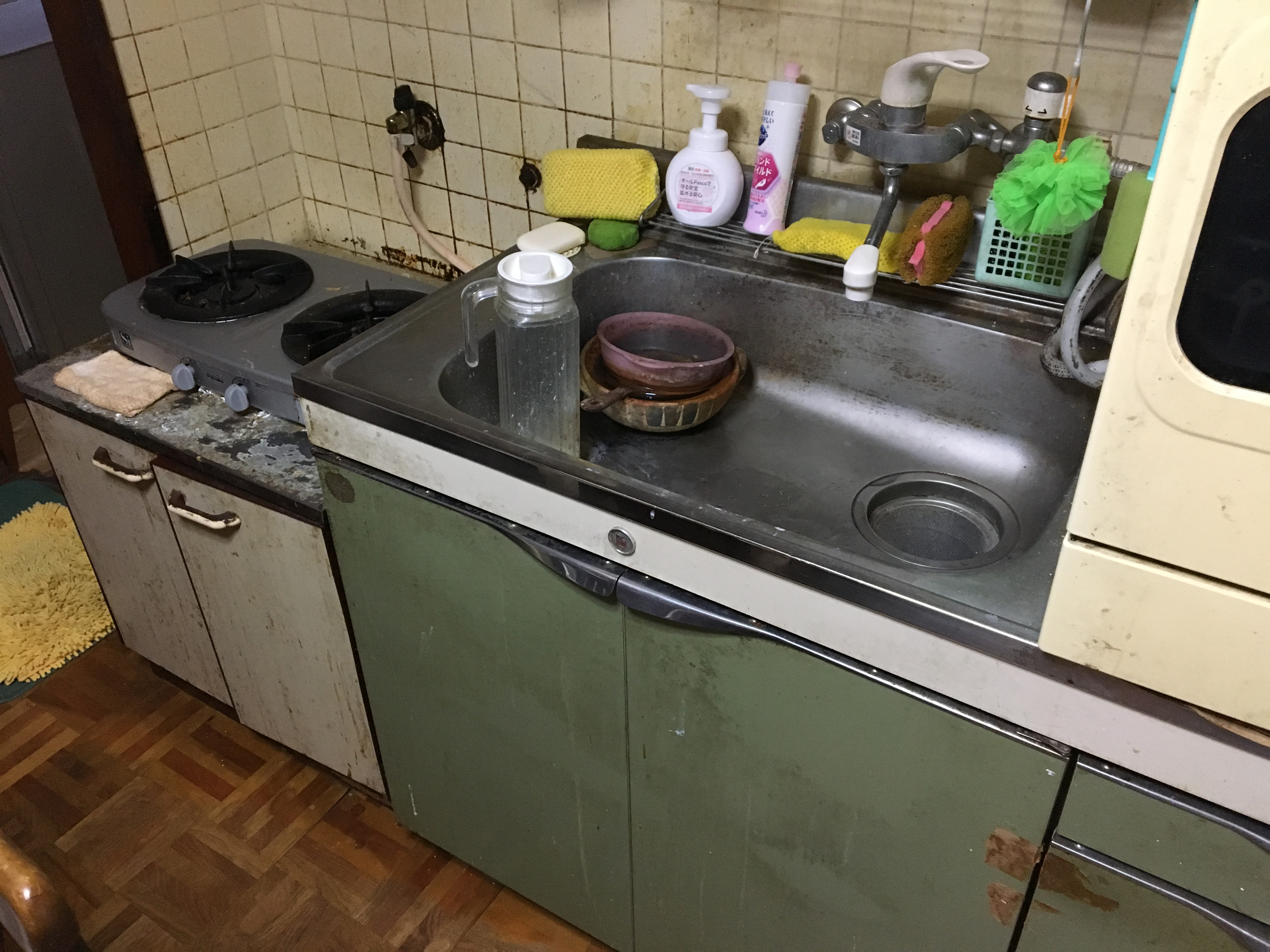 0.5坪のタイルの浴室を広くするため少し増築をして、ユニットバス0.75 坪(TOTO サザナ1216)に改装します。単体キッチンは、システムキッチンに取替えます。