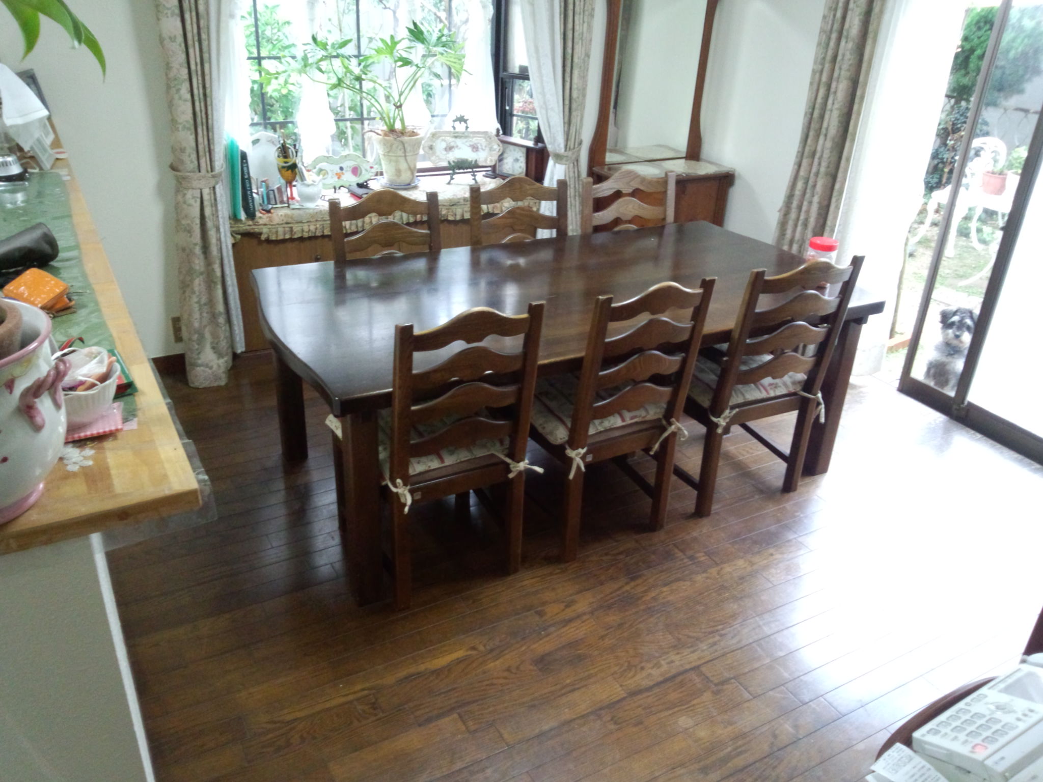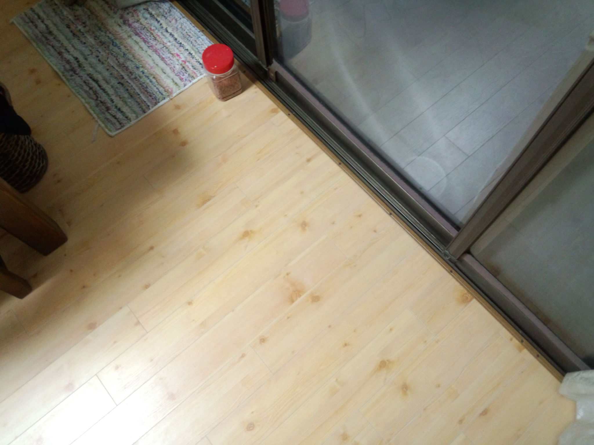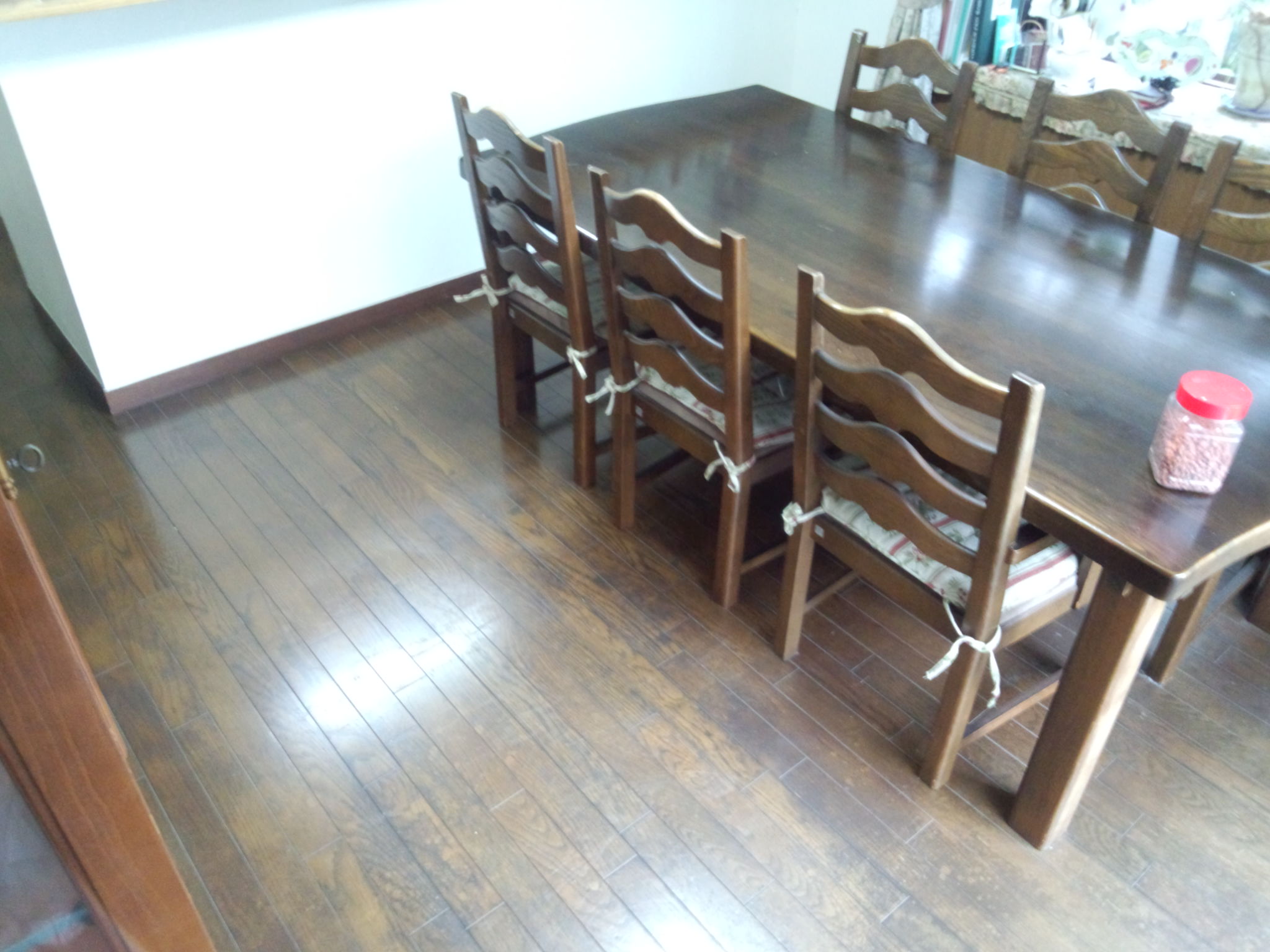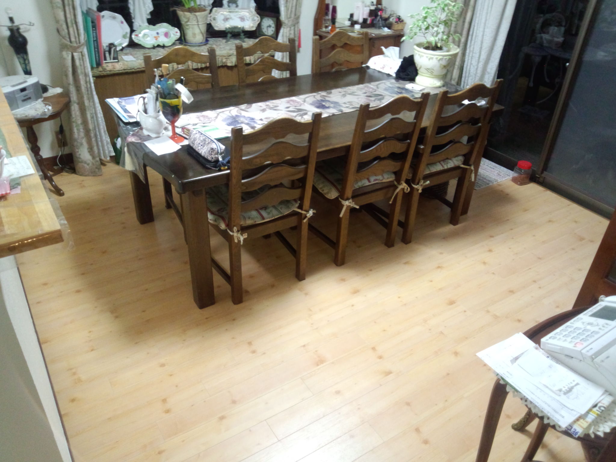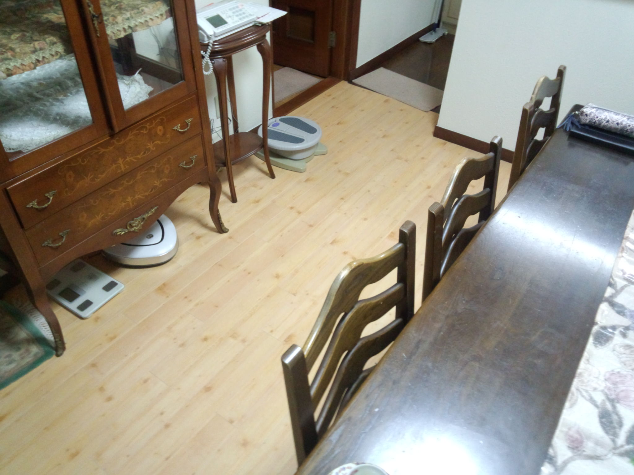 築30年以上のお宅のダイニングの床です。床材自体はしっかりしており問題はないのですが、表面がキズついていたり、汚れが目立つようになったので、工事を実施。 床材はフロアタイルを使用。フロアタイルとは塩ビ製で、素材を圧縮して硬く仕上げてある為、店舗の床など土足の場所でも用いられる材料です。今回の様なリフォームで既存の床の上への上張りにはもってこいの材料です。 パイン(松)材の柄で色は今までもよりも明るく、部屋全体が明るくなりました。