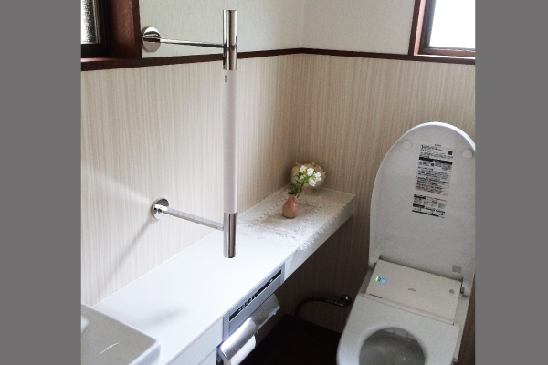小便器と大便器が置いてあった、タイル張りの二つのトイレ空間をつなげて、広い空間に。 冬の寒さ対策のために、壁にはベニヤ下地をしてクロスで仕上げ、床は廊下と高さが揃うように 少し上げて、フロアタイルで仕上げました。 ネオレストAH2Wは室内を暖房する機能付きなので、冬でも暖かく過ごせます。