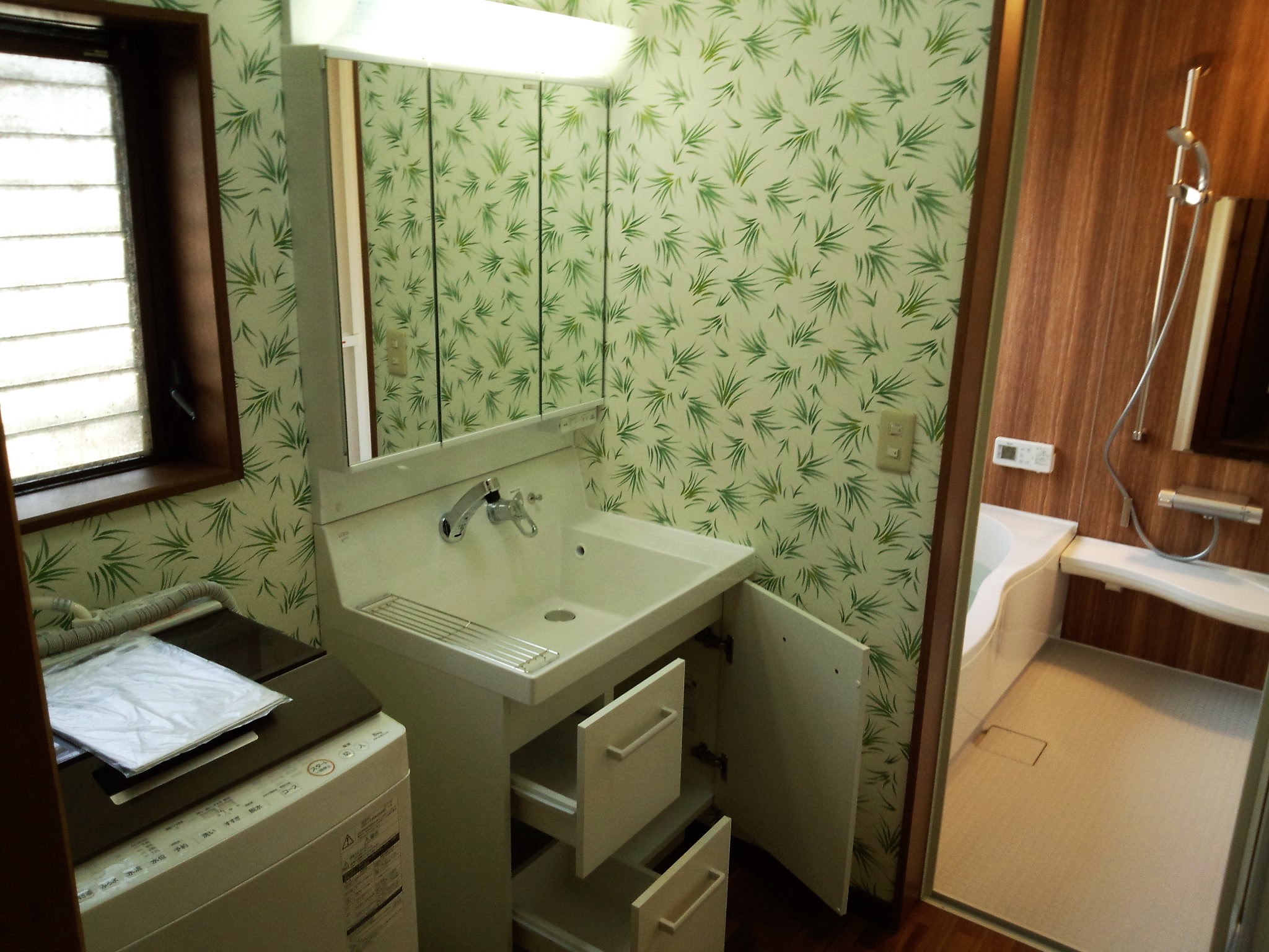 浴室・洗面所・トイレのリフォームです。今までは白を基調とした水廻りでしたが、壁紙などの色選択によりガラリと雰囲気が変わりました。