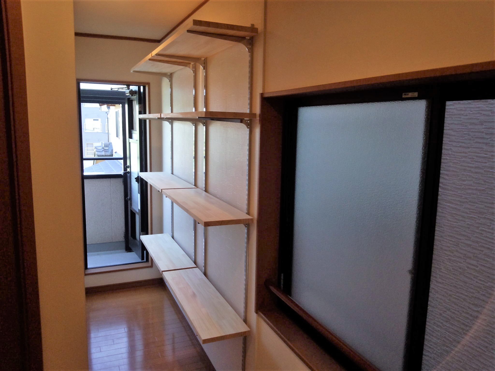お子様の成長に伴い、それぞれの個室をとご依頼いただきました。広い部屋の中心に壁を新設し、二部屋に分割します。そして廊下には、収納力抜群の棚を造作しました。